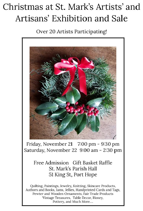 See Poster here : St. Mark's Artisans' Exhibition & Sale for times. Free admission.